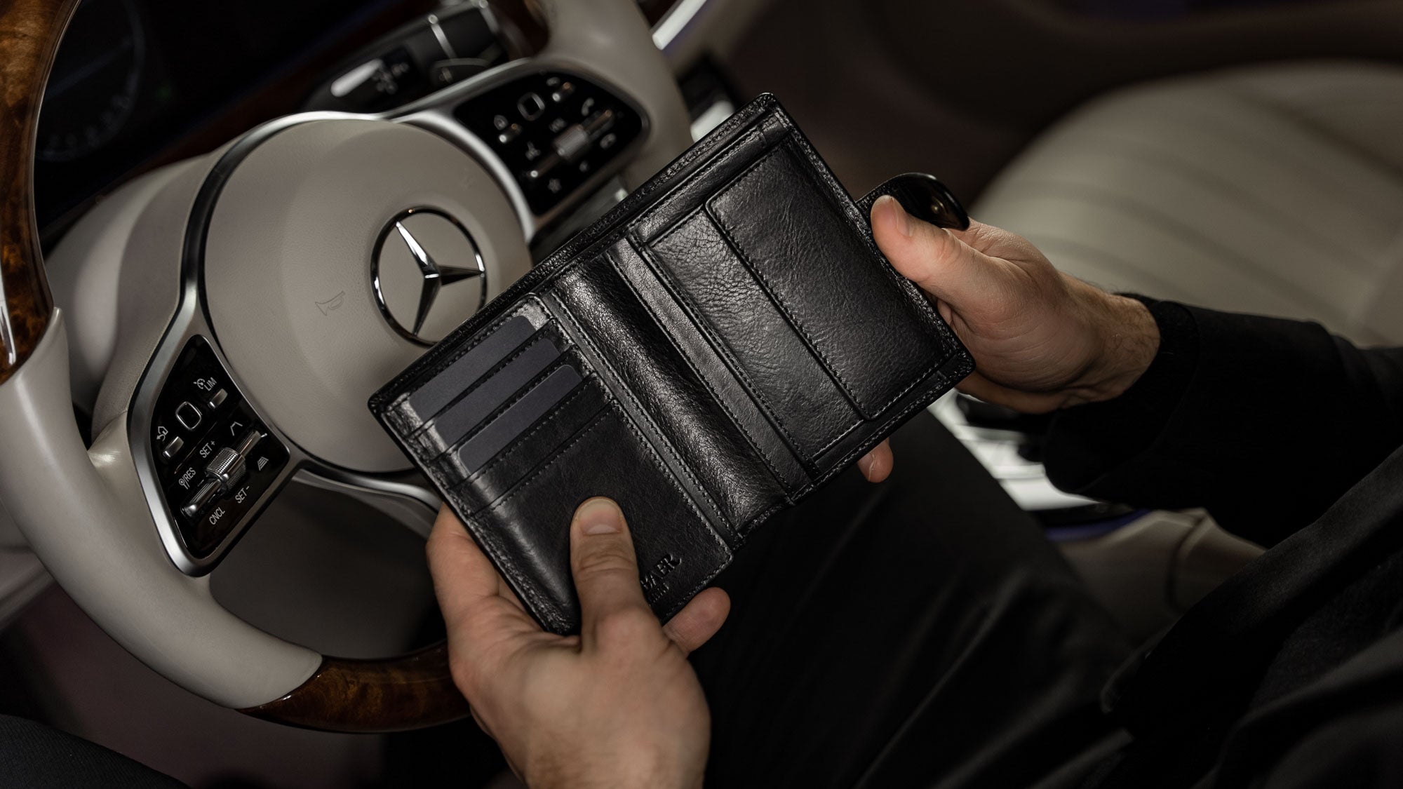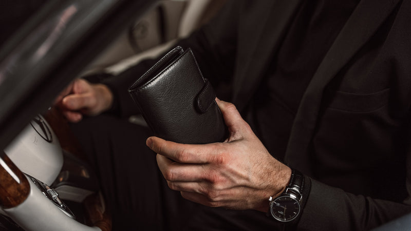 Von Baer Heritage premium men's leather trifold wallet in solid brown, in the car, slider. Von Baer Heritage premium men's leather trifold wallet in solid brown, in the car, slider.