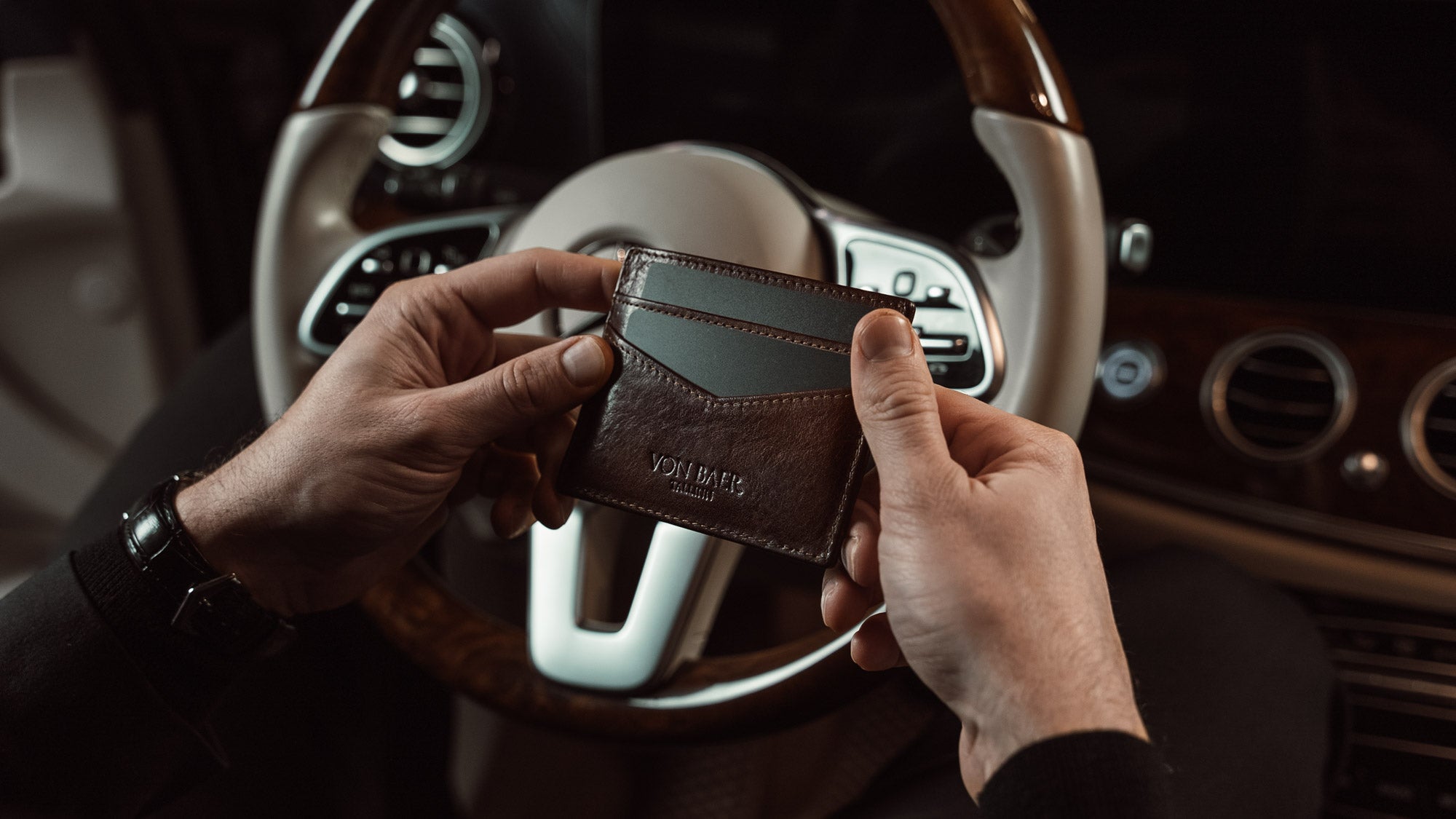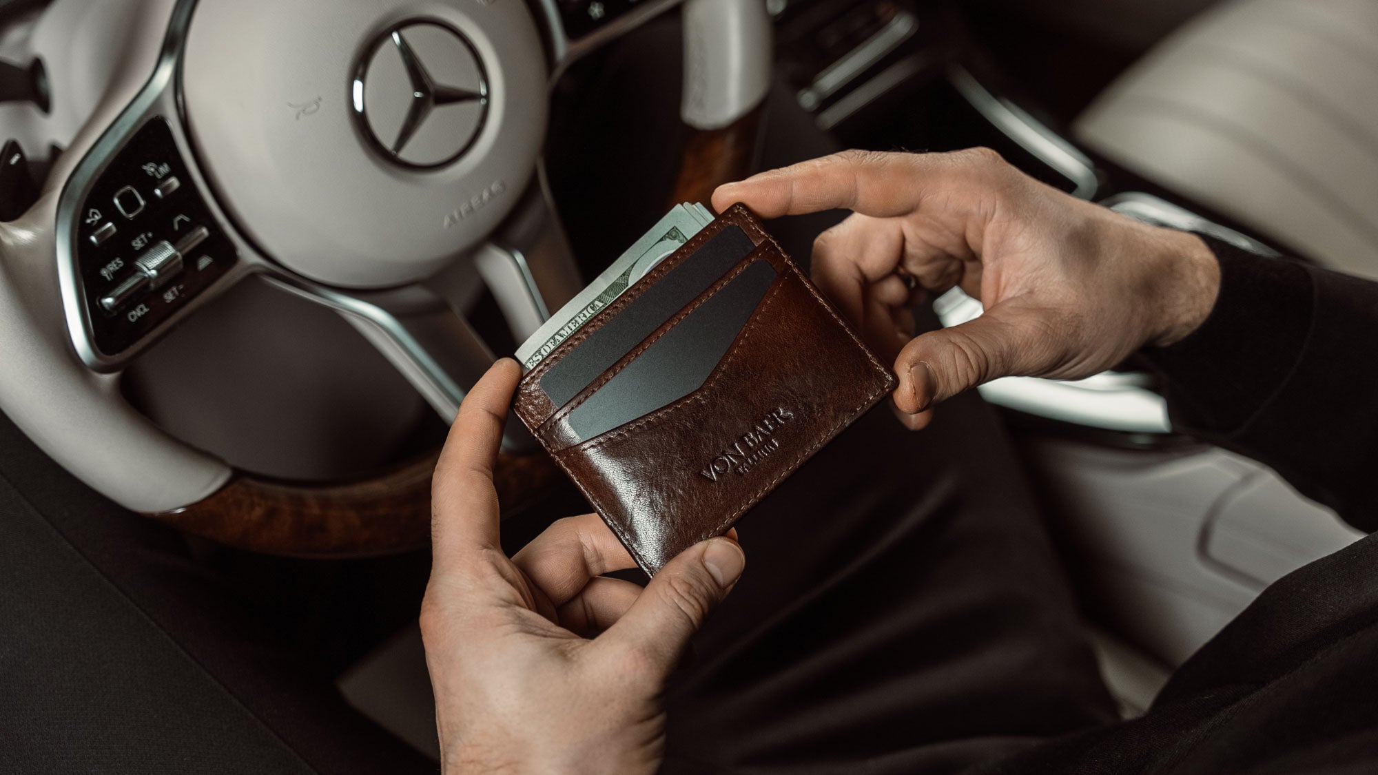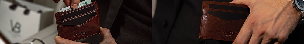 With two card slots on each side, it offers just enough space for your essential cards, ID, and folded notes — including major currencies like US dollars, euros, and British pounds. Handmade from luxurious full-grain, vegetable-tanned Italian "Cuoio Superiore" leather, the Minimalist is available in elegant black, solid brown, and classic tan.