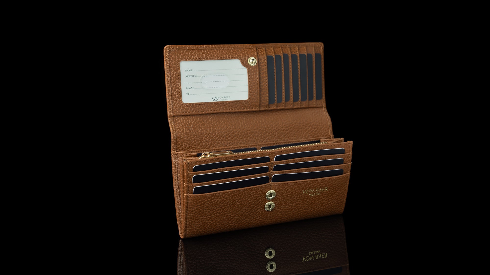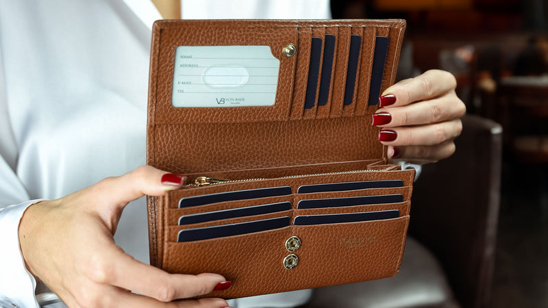 This large accordion-style wallet includes two main compartments: a central zippered coin pocket and multiple card slots. RFID protection keeps your card data secure. The handcrafted leather showcases rich colour and natural imperfections — a mark of authenticity. It’s the perfect compact alternative to a clutch for the fashion-forward modern woman.